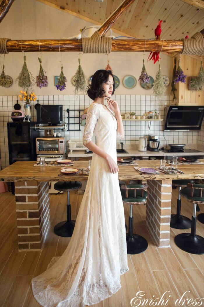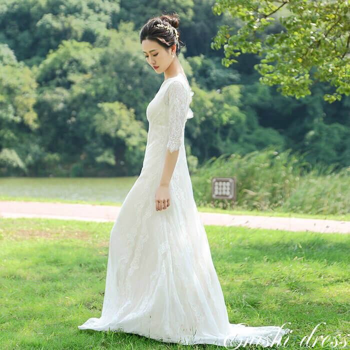 ウェディングドレス スレンダーライン ロングドレス フォトウエディング 総レース 七分袖 Vネック 背面V字