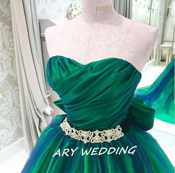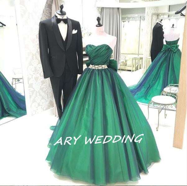 カラードレス 緑 ベアトップ 上質オーガンジー 華やかなトレーン クラシカル 憧れのドレス