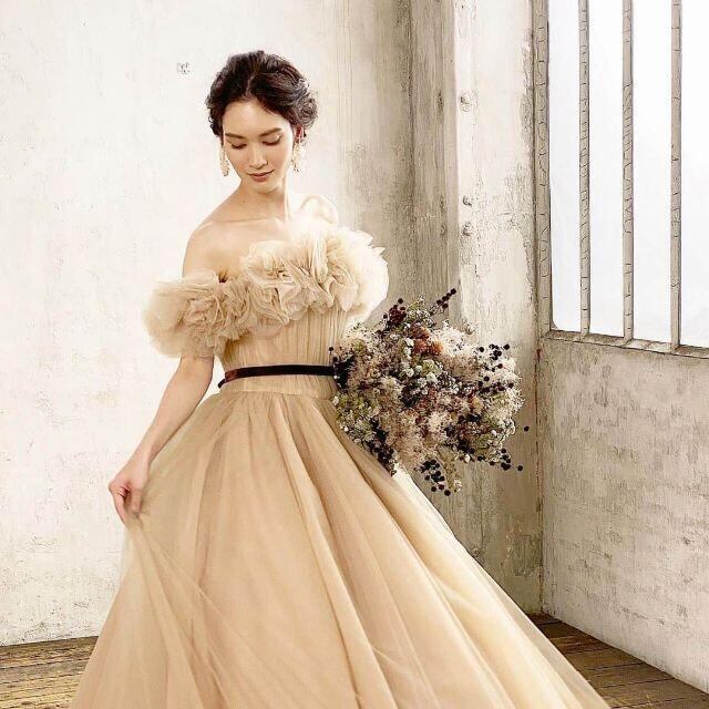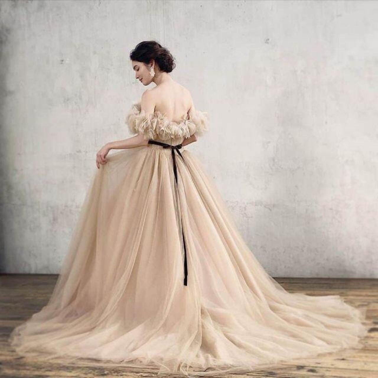 ベージュ カラードレストレーン 取り外しオフショルダー サッシュベル