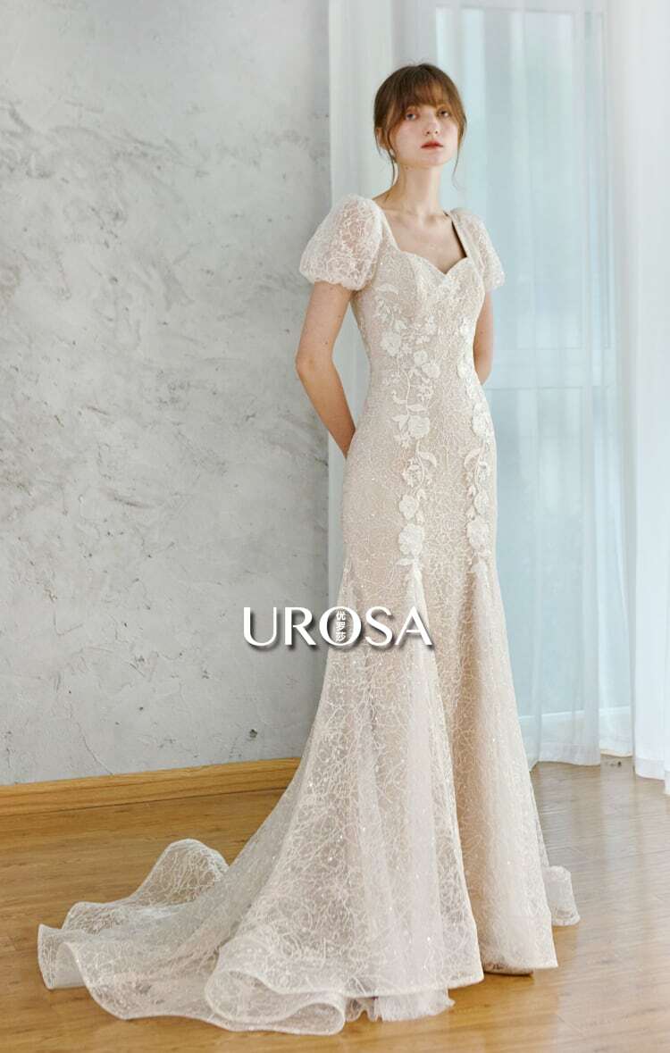 ウエディングドレス 薄シャンパン色 3D立体レース刺繍 マーメイドライン パフスリーブ