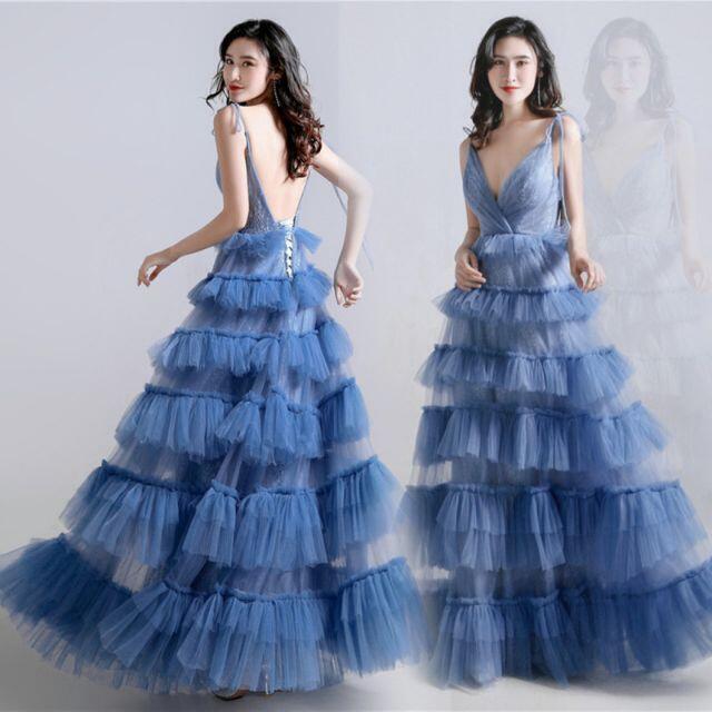 カラードレス 青/ブルー ソフトチュール 背中見せ 深Vネック