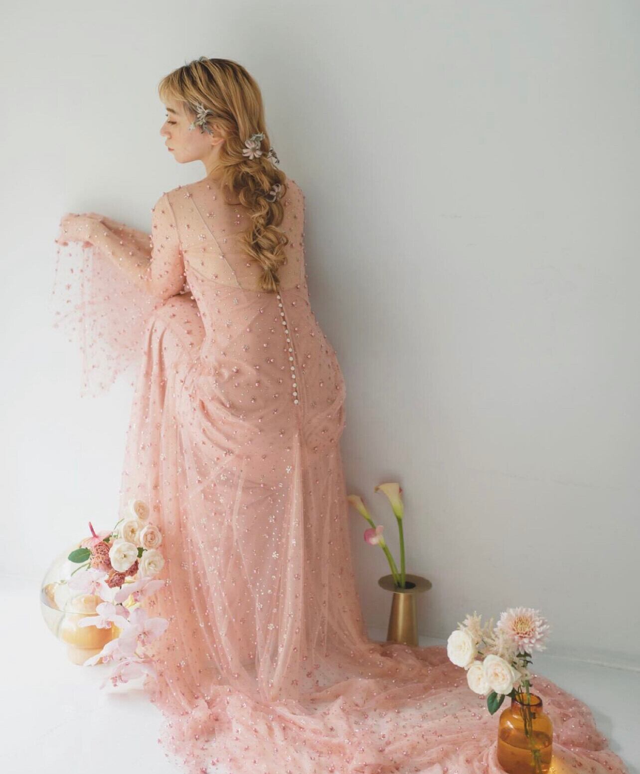 ウエディングドレス ピンク パール 華やか 結婚式/披露宴 2次会