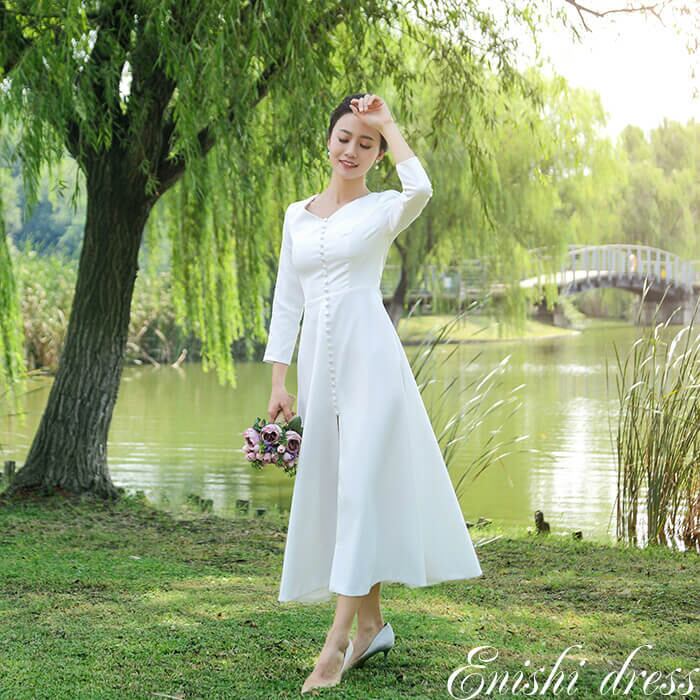 ウェディングドレス ミモレ丈 七分袖 サテン Vネック ボタン スリット 結婚式 披露宴