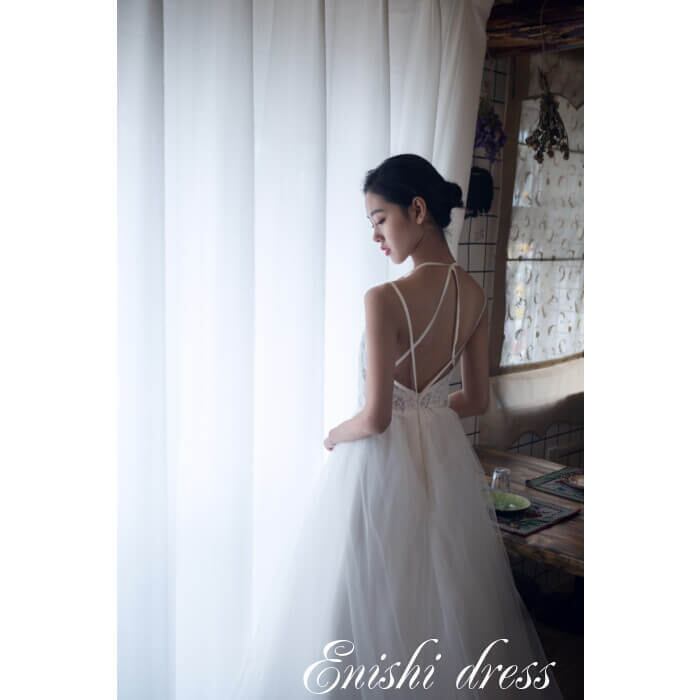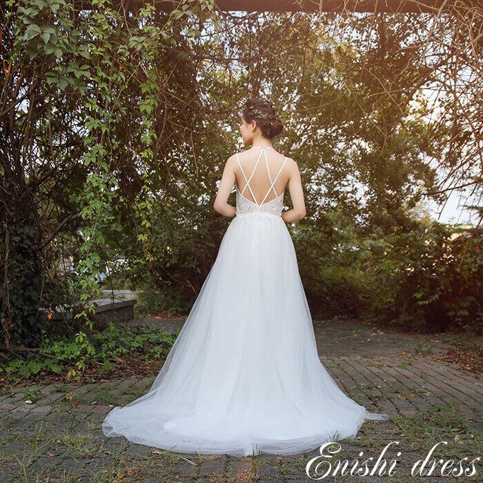 ウェディングドレス オフホワイト レースバックストラップ レース チュール 柔らかい