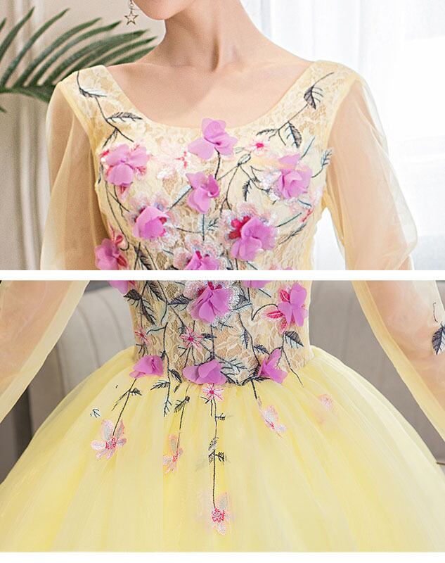 ステージ 衣装 演奏会用ドレス ロングドレス 長袖 上品 プリンセスラインドレス イエロー ウエディングドレス 花嫁 二次会 結婚式 成人式 フォーマルドレス パーティードレス 刺繍