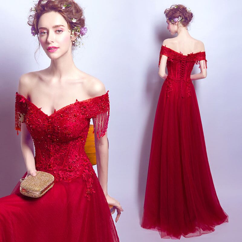 カラードレス 半袖 赤 花嫁 カクテルドレス 結婚式 上品 パーティードレス 二次会 イブニングドレス レッド オフショルダー 海外挙式 お嬢様 発表会
