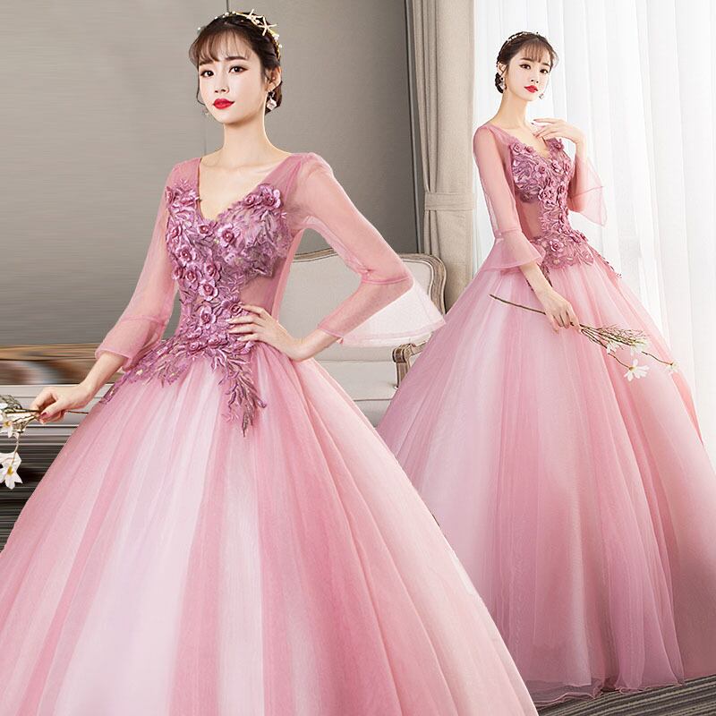 ステージ 衣装 長袖 演奏会用ドレス ロングドレス 上品 ピンク プリンセスラインドレス Vカット ウエディングドレス 花嫁 二次会 結婚式 成人式