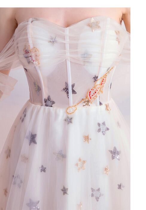 カラードレス ロングドレス シャンパン色 花嫁 パーティードレス ウェディングドレス 演奏会用 ロングドレス 星 オフショルダー Aライン 舞台衣装 おしゃれ ステージ衣装 透け感