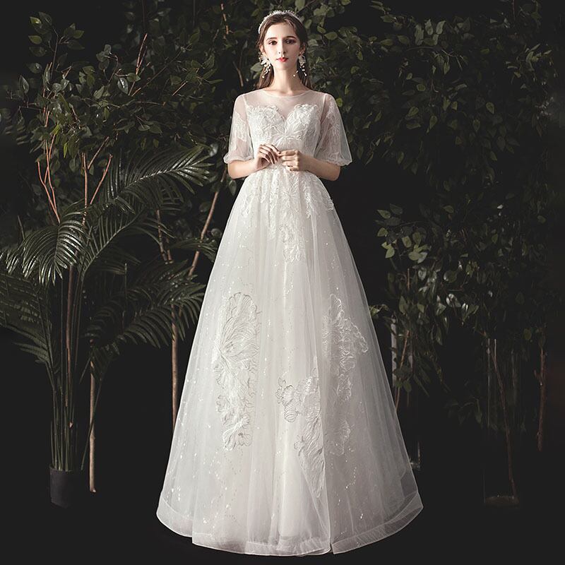 ブライダル ロングドレス ウエディングドレス 半袖 花嫁 Aラインドレス リゾートドレス 前撮り 挙式 Wedding dress 結婚式 上品 二次会 シンプル ブライダル ロングドレス 刺繍