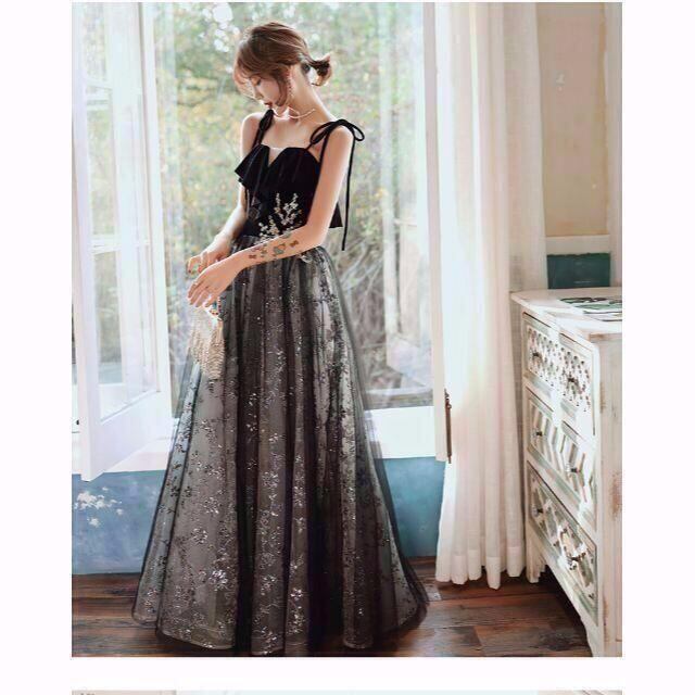パーティードレス 黒 キャミソール プリンセスライン ロングドレス