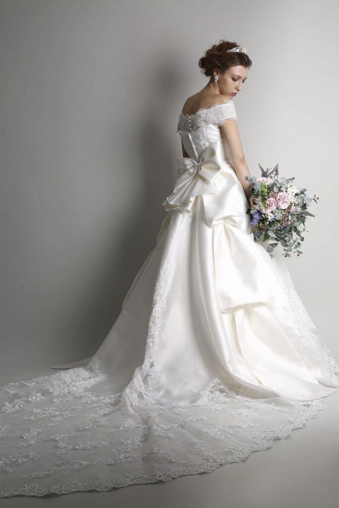 ウエディングドレス オフショルダー フレンチスリーブ ふっくら柔らかなバックリボン ロングトレーン