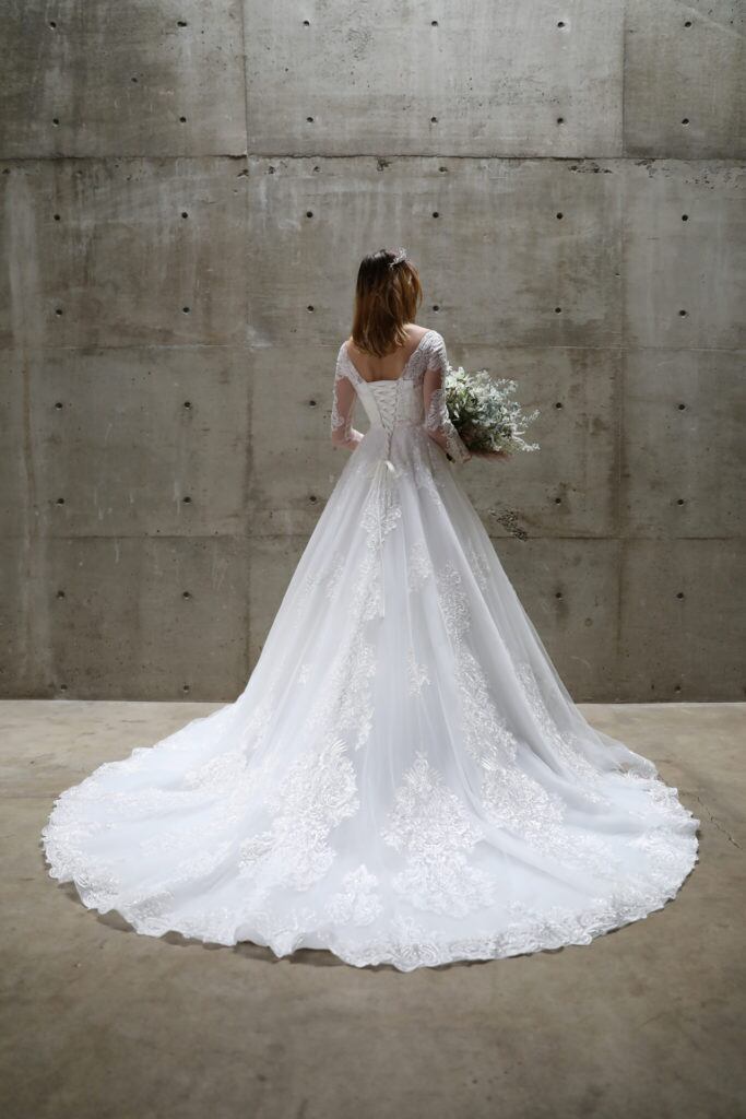 純白 ウエディングドレス ベアトップ チュールスカート 華やかなトレーン