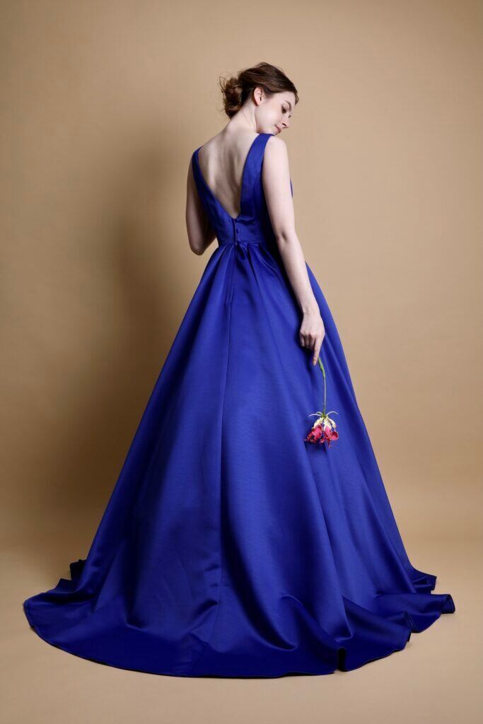 【お買得パニエ無料】カラードレス 青 クルーネック 背中見せ くるみボタン トレーン/ロング