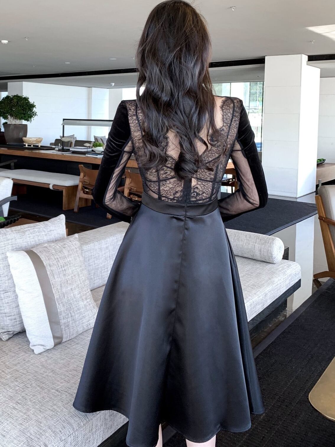 ブラック レース パーティードレス 光沢サテン エンパイアライン ワンピース Aライン 気質