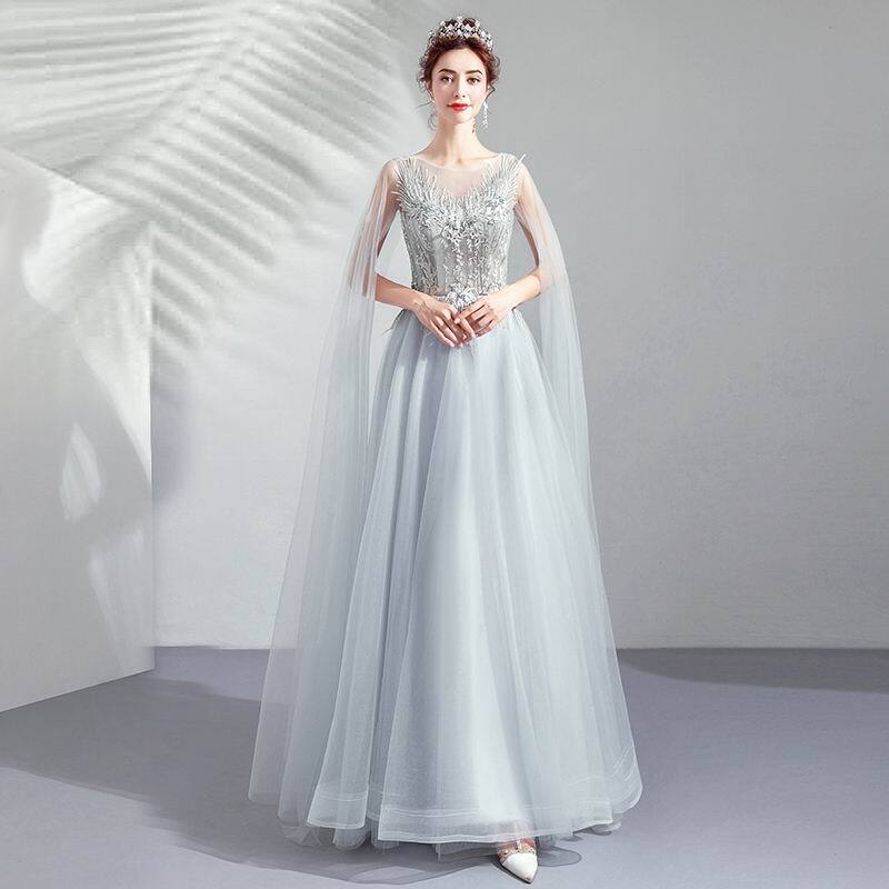 高品質!ブライダル 演奏会 ウエディングドレス ケープ風ドレス グレー ビスチェ ラウンドネック エレガント 細見えシルエット