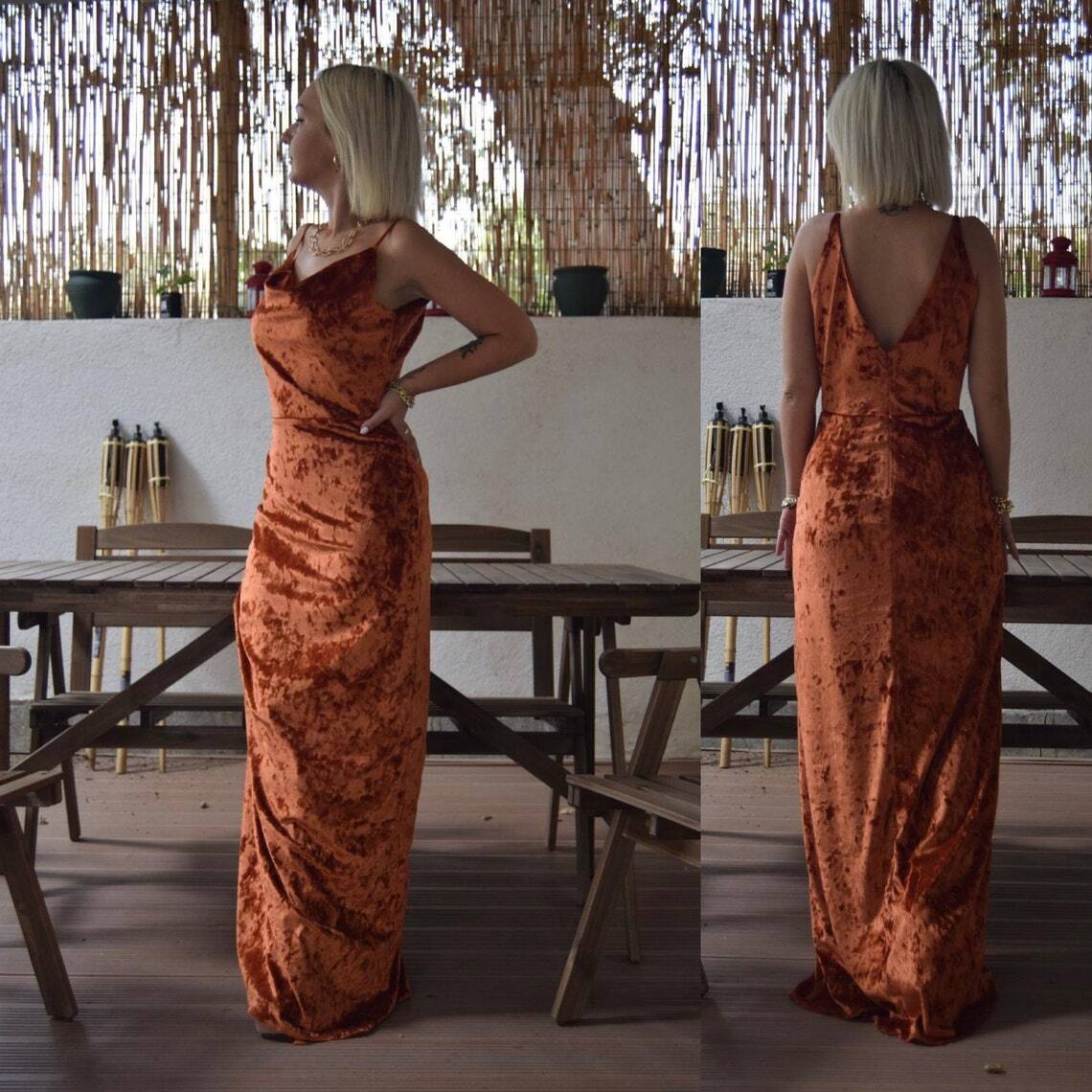 テラコッタ色 ビロード パーティードレス キャミソール ラウンドネック 背中見せ セクシー
