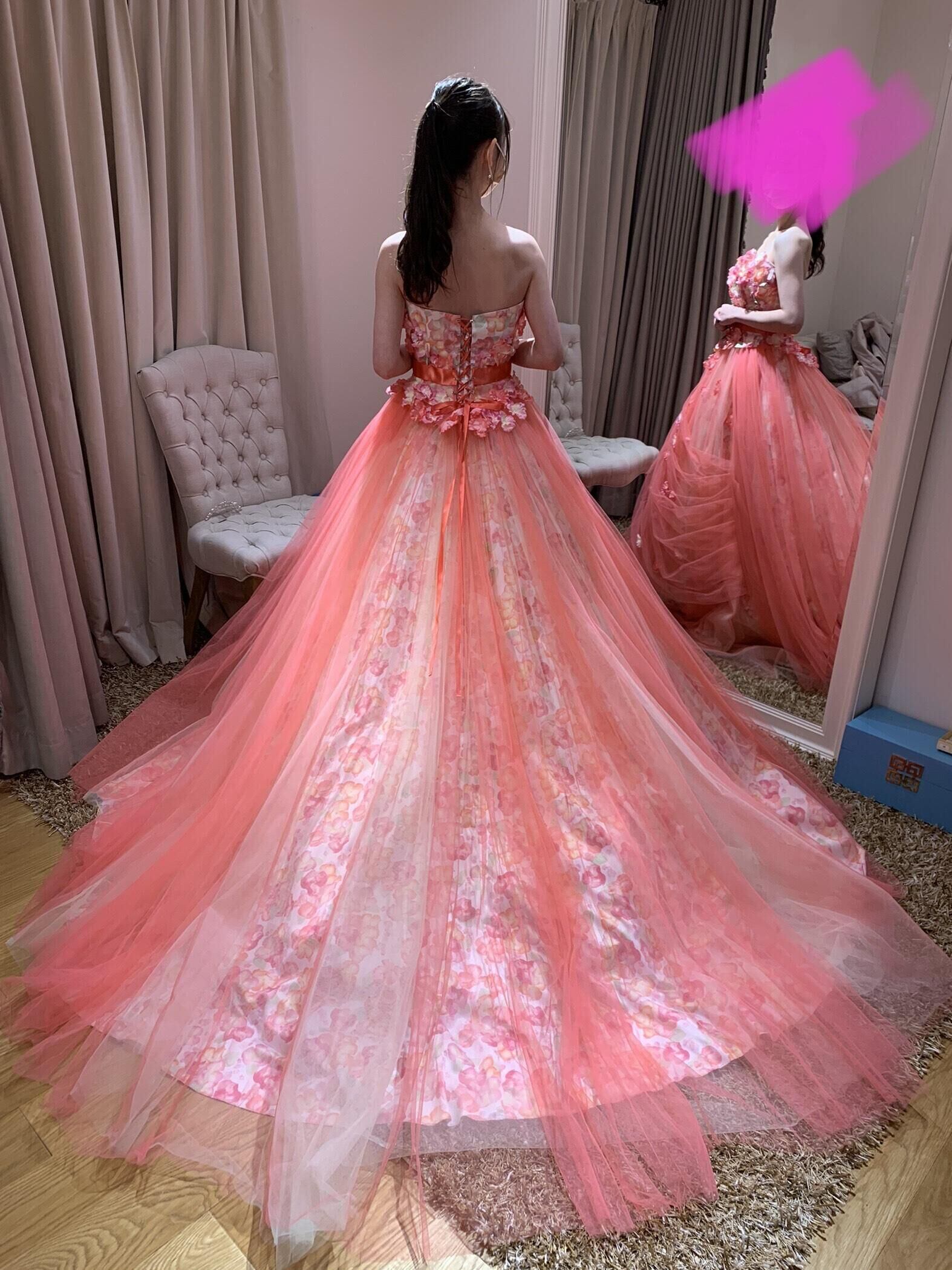 豪華!カラードレス 演奏会 オーダーメイド オレンジ ベアトップ ビスチェ ソフトチュール トレーン