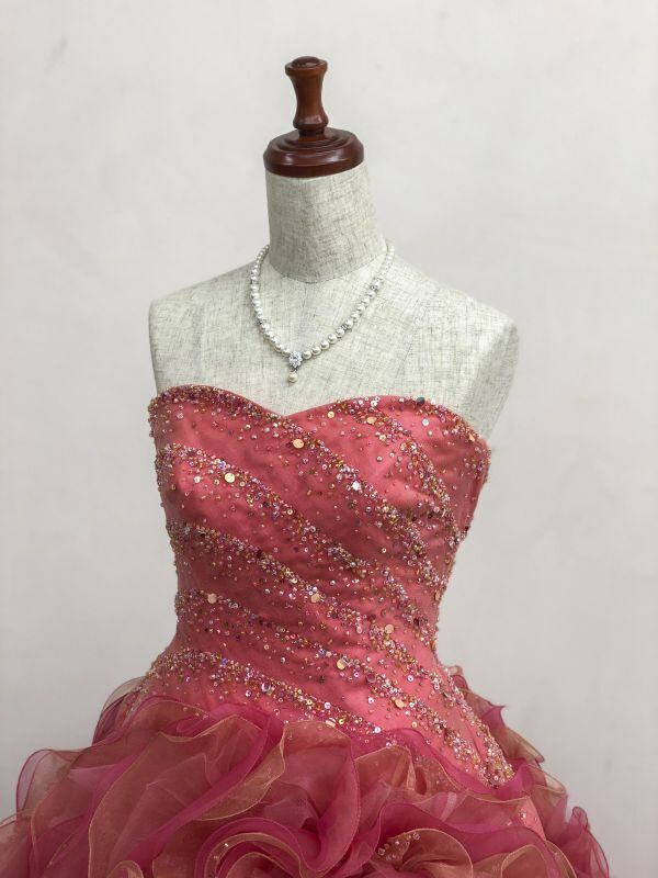 【お買得パニエ無料】Aライン チェリーピンク カラードレス ベアトップ オーダーメイド 華やかなトレーン