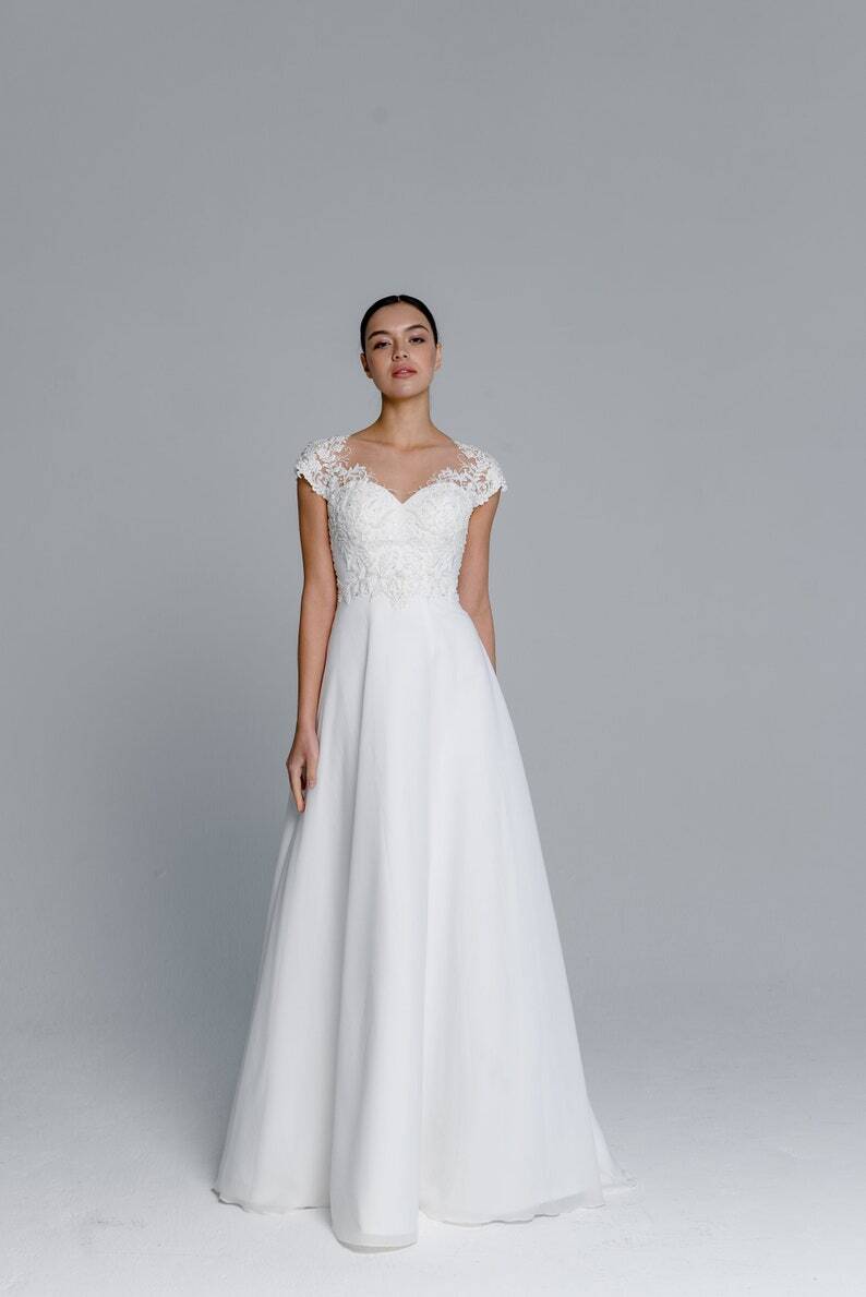 ウエディングドレス ボレロ エレガント Vネック 短トレーン スレンダーライン くるみボタン