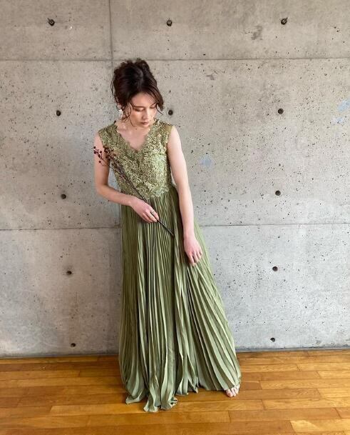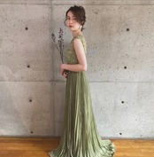 パーティードレス グリーン エレガント ラウンドネック ノースリーブ トレーン 結婚式