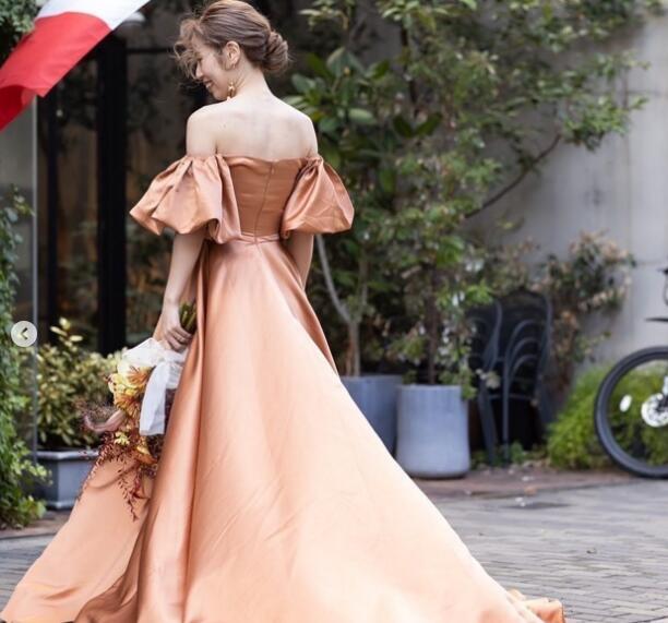 パーティードレス 薄シャンパンの色 オフショルダー パフスリーブ 結婚式 ファスナー トレーン