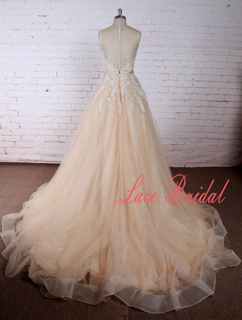 レース ウエディングドレス Aライン キャミソール 背中見せ くるみボタン 結婚式