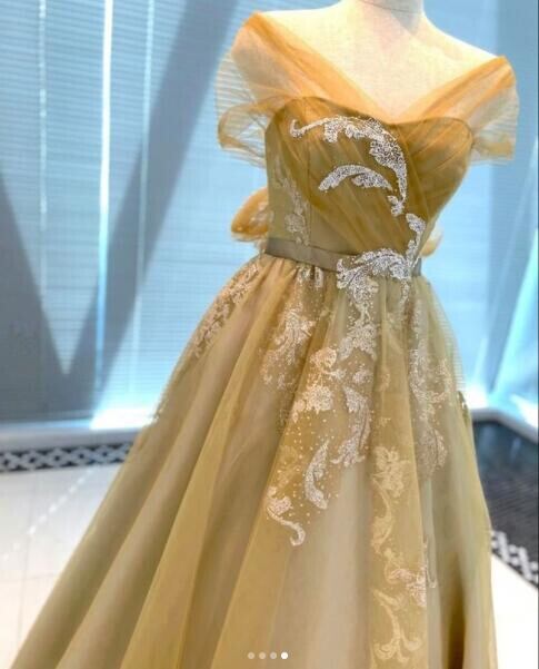 カラードレス カーキ色 花嫁 レース エレガント Vネック ソフトチュール 演奏会