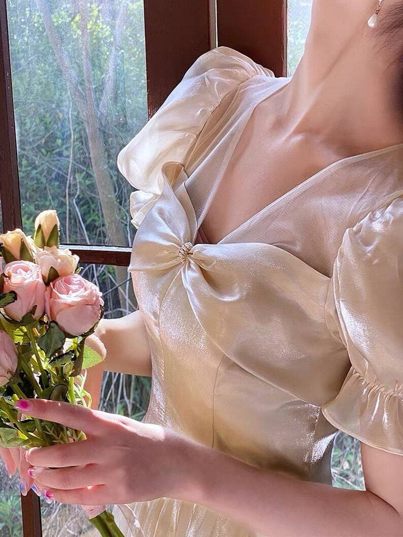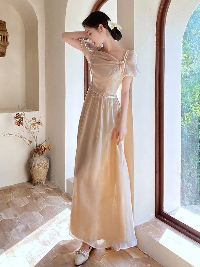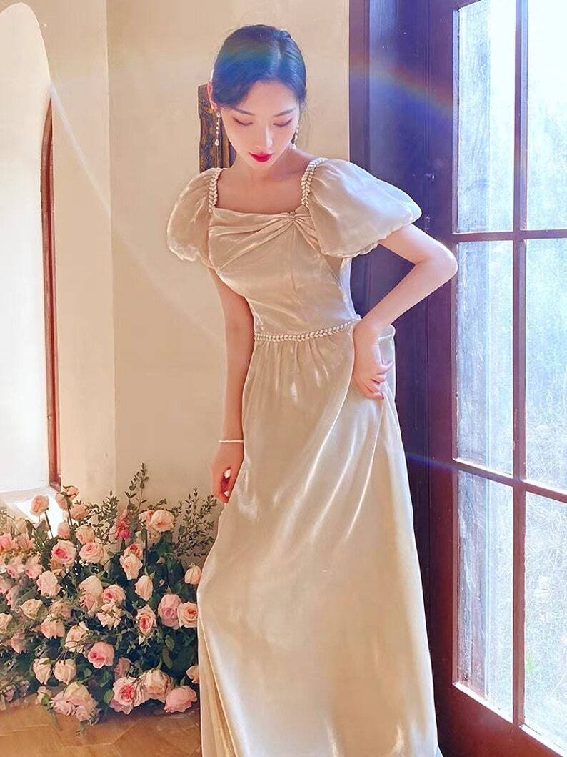 パーティードレス 薄シャンパンの色 パフスリーブ エレガント ロング 披露宴
