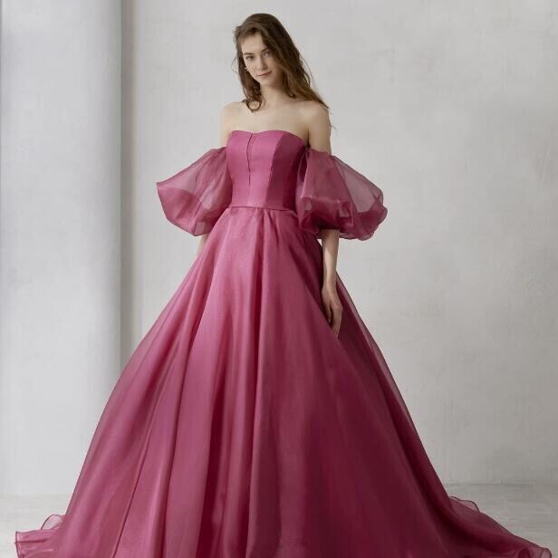 コピー:カラードレス ピンク紫 取り外し袖 ベアトップ リボン 結婚式 華やかなトレーン