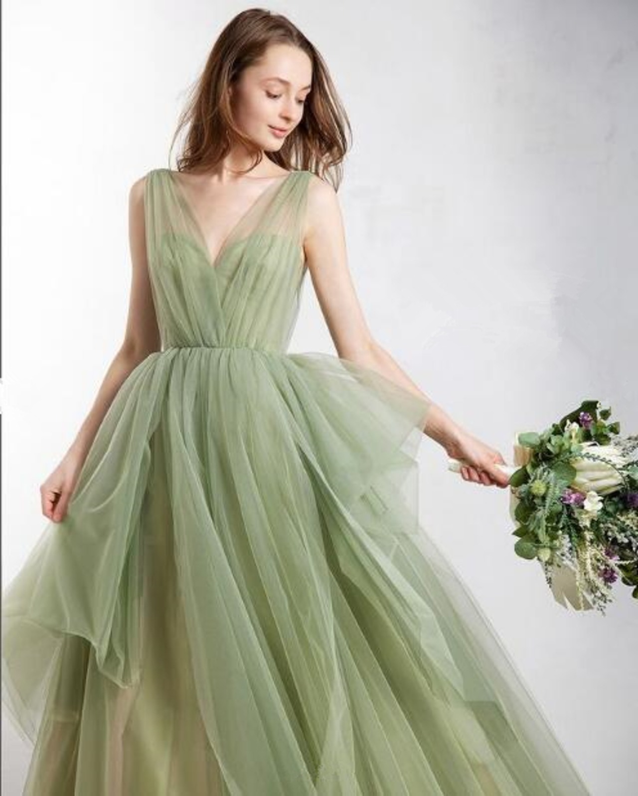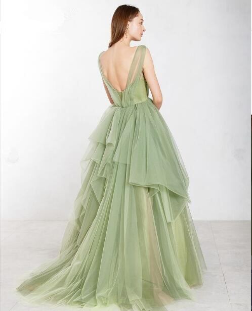 カラードレス グリーン 花嫁 チュールスカート Vネック Aライン 背中見せ 結婚式