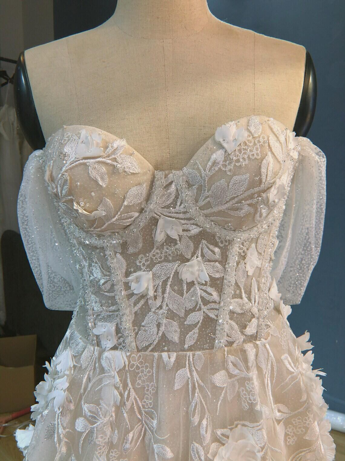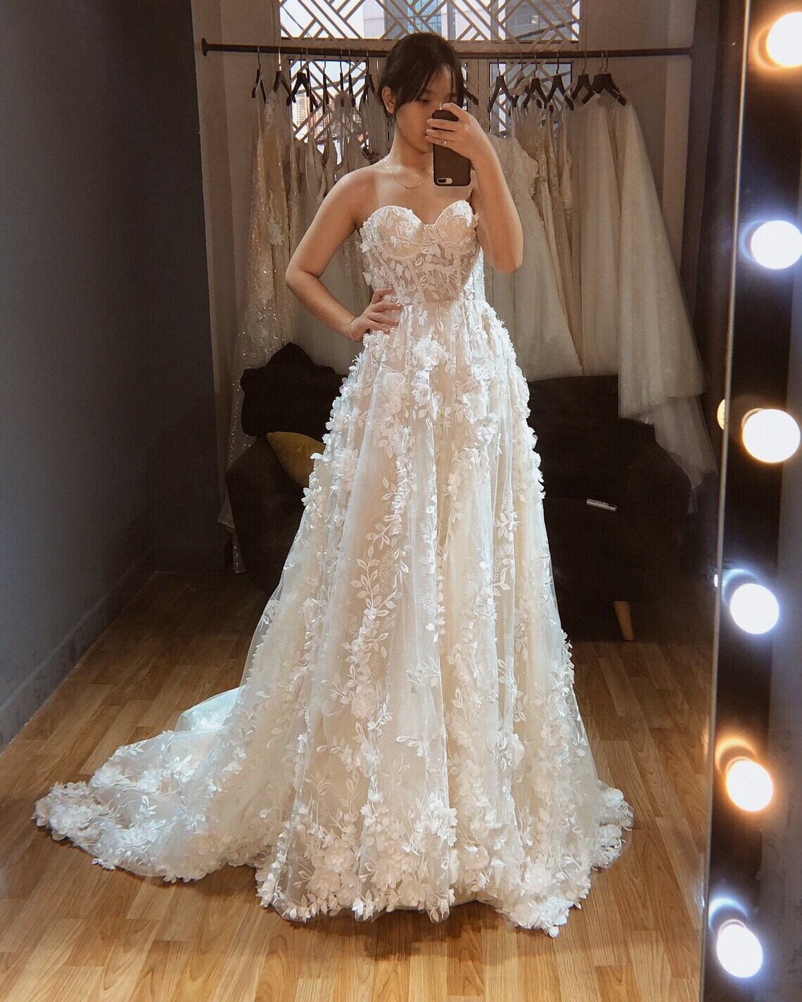 ボタニカル柄のドレス 花嫁 花レース キラキラチュール トレーン 結婚式