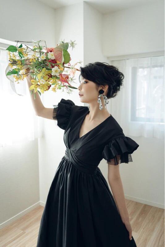 オーダーメイド可能 パーティードレス 黒 エレガント Vネック 二次会 トレーン