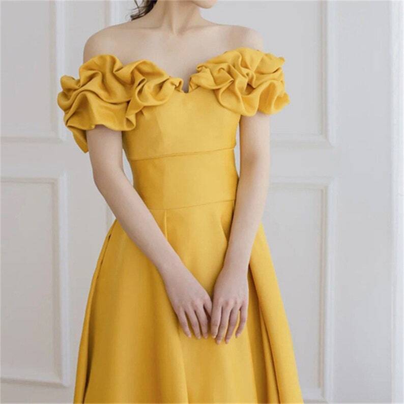 可愛い 編み上げ イタリアサテン 黄色い オフショルダー 謝恩会/音楽会