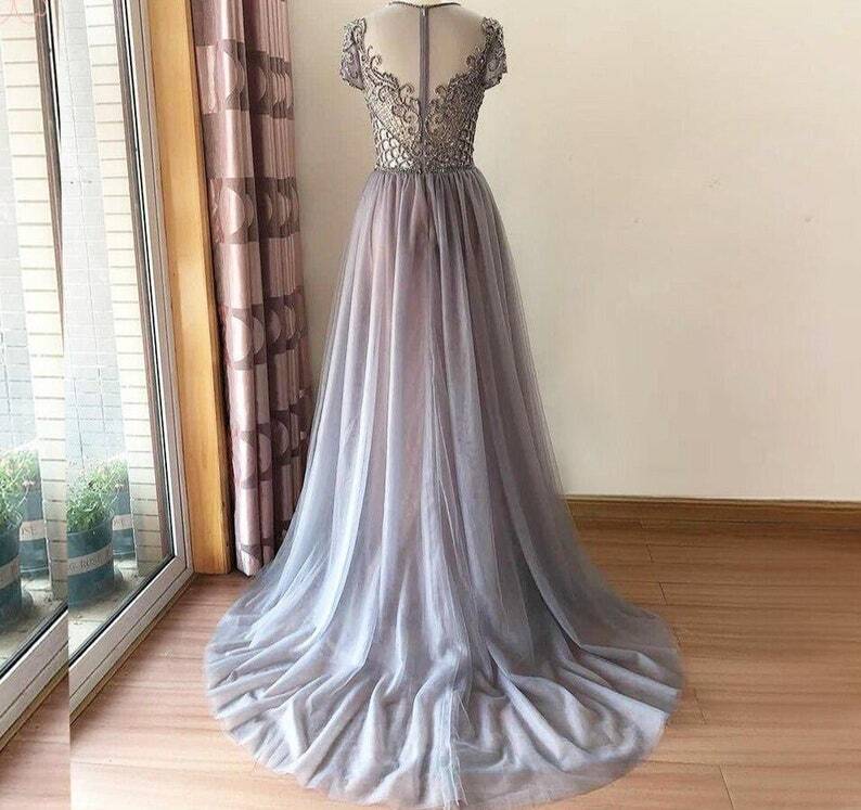 パーティードレス ブルーグレー/赤 レース エレガント 半袖 トレーン 拳式/発表会
