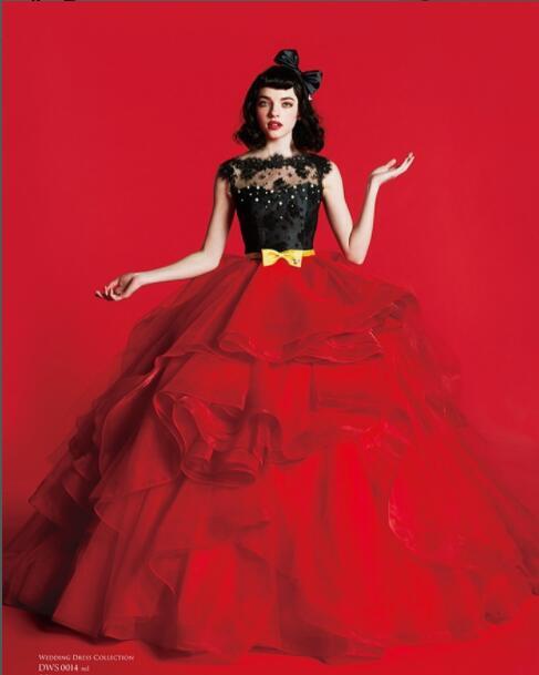 豪華! カラードレス 黑/赤 プリンセスライン 柔らかく重ねたチュールスカート リボン クラシカル トレーン 花嫁 結婚式
