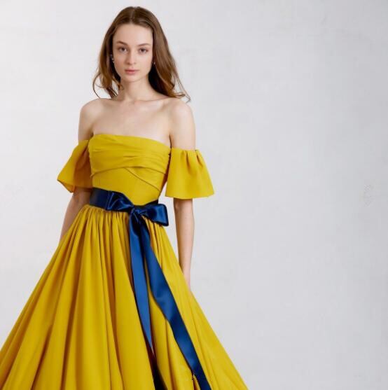 パーティードレス 黄色い ベアトップ 取り外し袖 編み上げ トレーン エレガント サッシュベルト 花嫁 前撮り/結婚式