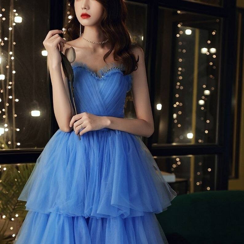 カラードレス 青 ベアトップ パール 編み上げ 細見えシルエット ソフトチュール ノースリーブ エレガント 演奏会/音楽会