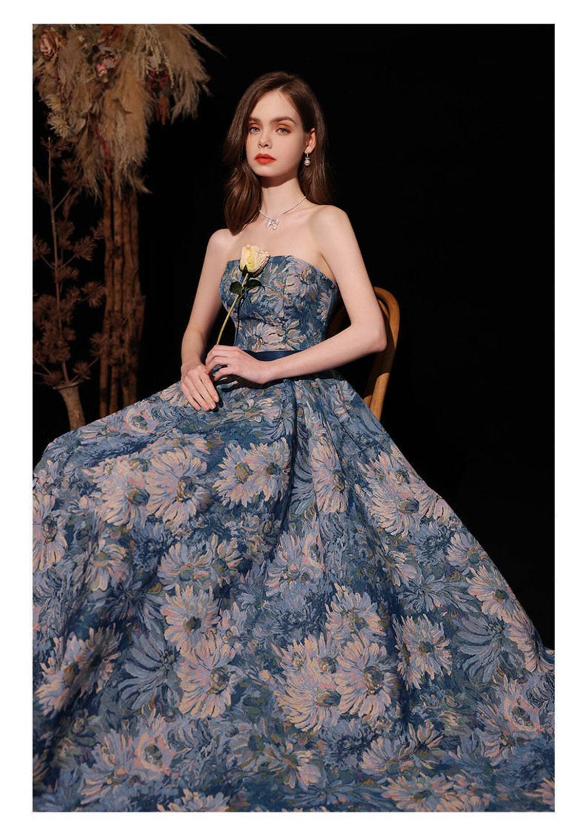 パーティードレス 取り外し袖 パフスリーブ ベアトップ 編み上げ クラシカル 青 サッシュベルト 前撮り