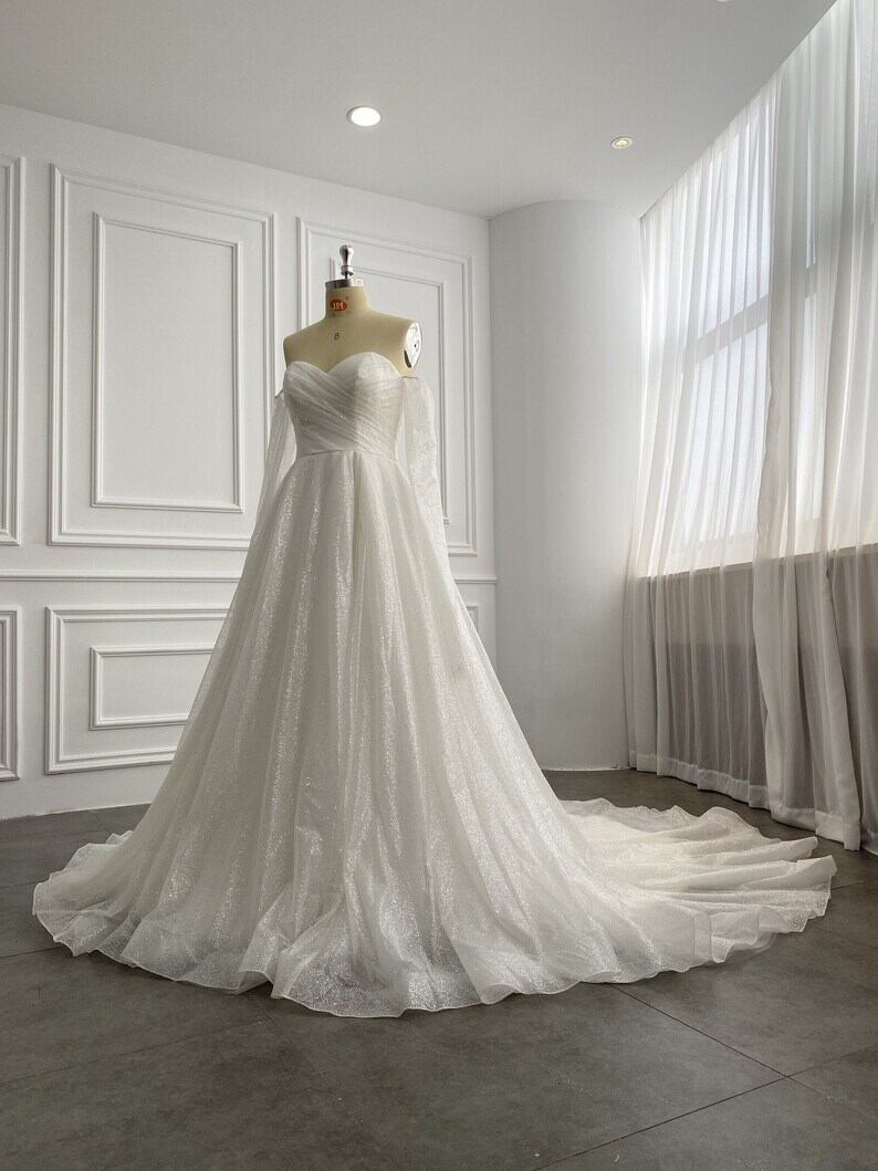 ウエディングドレス オフホワイト キラキラチュール ベアトップ 取り外し袖 ファスナー 花嫁 結婚式