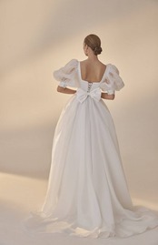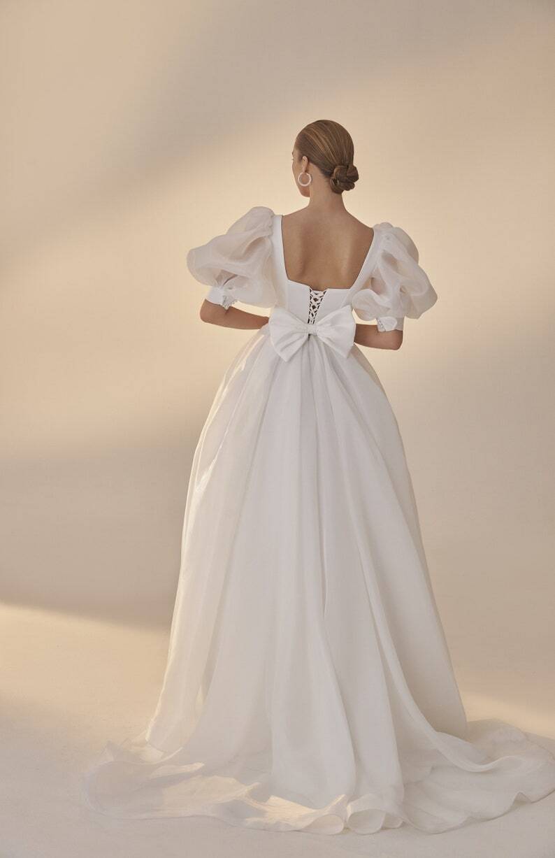 ウエディングドレス フランス風 オフホワイト パフスリーブ 編み上げ リボン トレーン 結婚式/披露宴