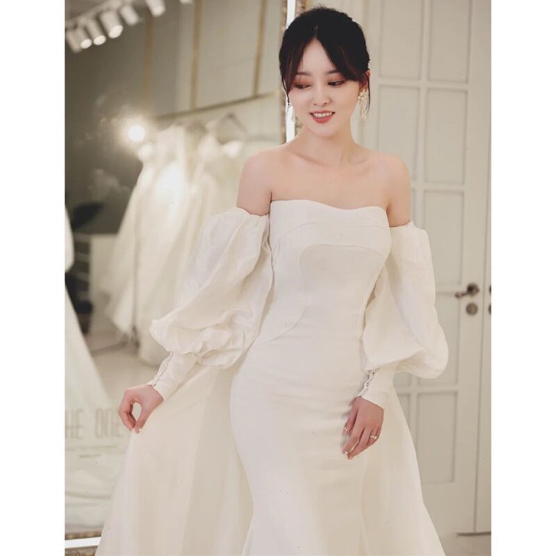 パーティードレス フランス風 可愛い ベアトップ マーメイドライン 取り外し袖 トレーン 結婚式/前撮り