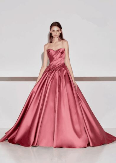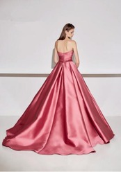 上品!パーティードレス ビビッドピンク ベアトップ 光沢サテン ファスナー Aライン 花嫁 拳式 結婚式