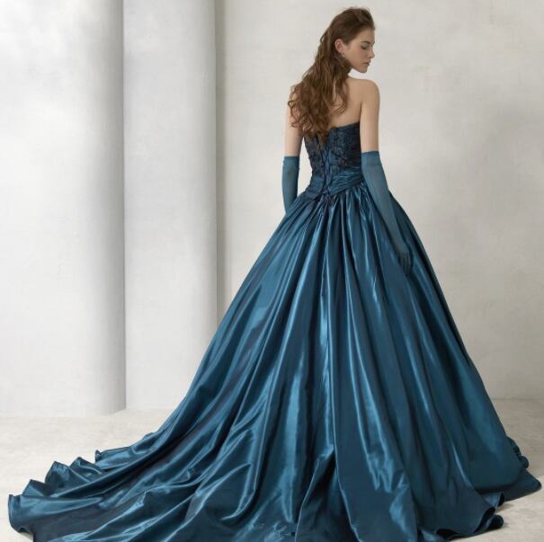カラードレス 紺 レース ベアトップ グローブ 華やか クラシカル 編み上げ トレーン Aライン 花嫁 結婚式