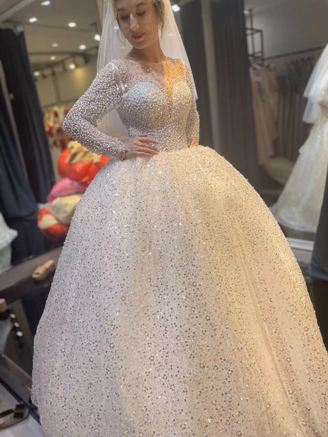 ウエディングドレス パール キラキラチュール 長袖 クルーネック 華やかなトレーン 編み上げ 花嫁 結婚式
