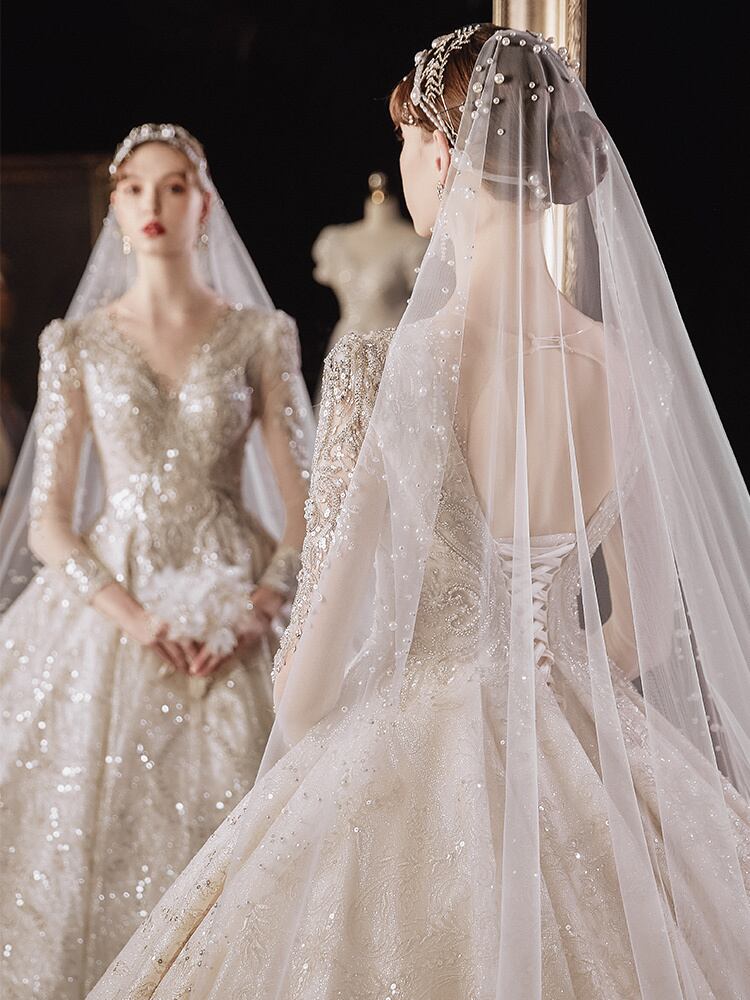 豪華! 花嫁 绮丽な ハンドメイド ウエディングドレス キラキラ 刺繍 長袖 編み上げ 華やかなトレーン 結婚式