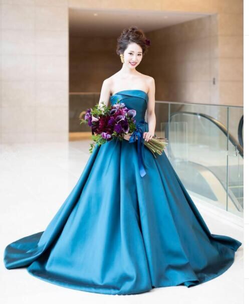 人気上昇! 結婚式 可愛い パーティードレス 青 ベアトップ ファスナー 素敌な 拳式 ノースリーブ Aライン
