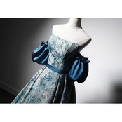 優しい ベアトップ パーティードレス 薄青 編み上げ パフスリーブ エレガント 謝恩会 拳式 プリント模様