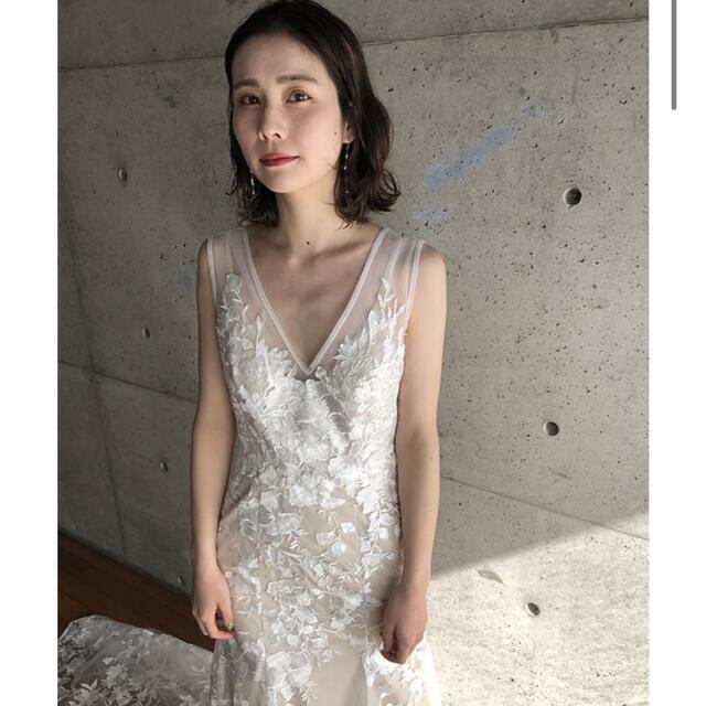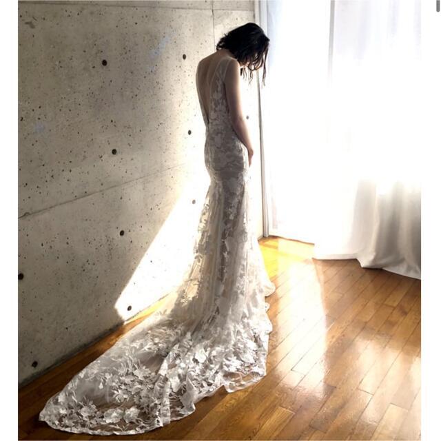 レース パーティードレス Vネック マーメイドライン トレーン 背中見せ ノースリーブ 結婚式/前撮り