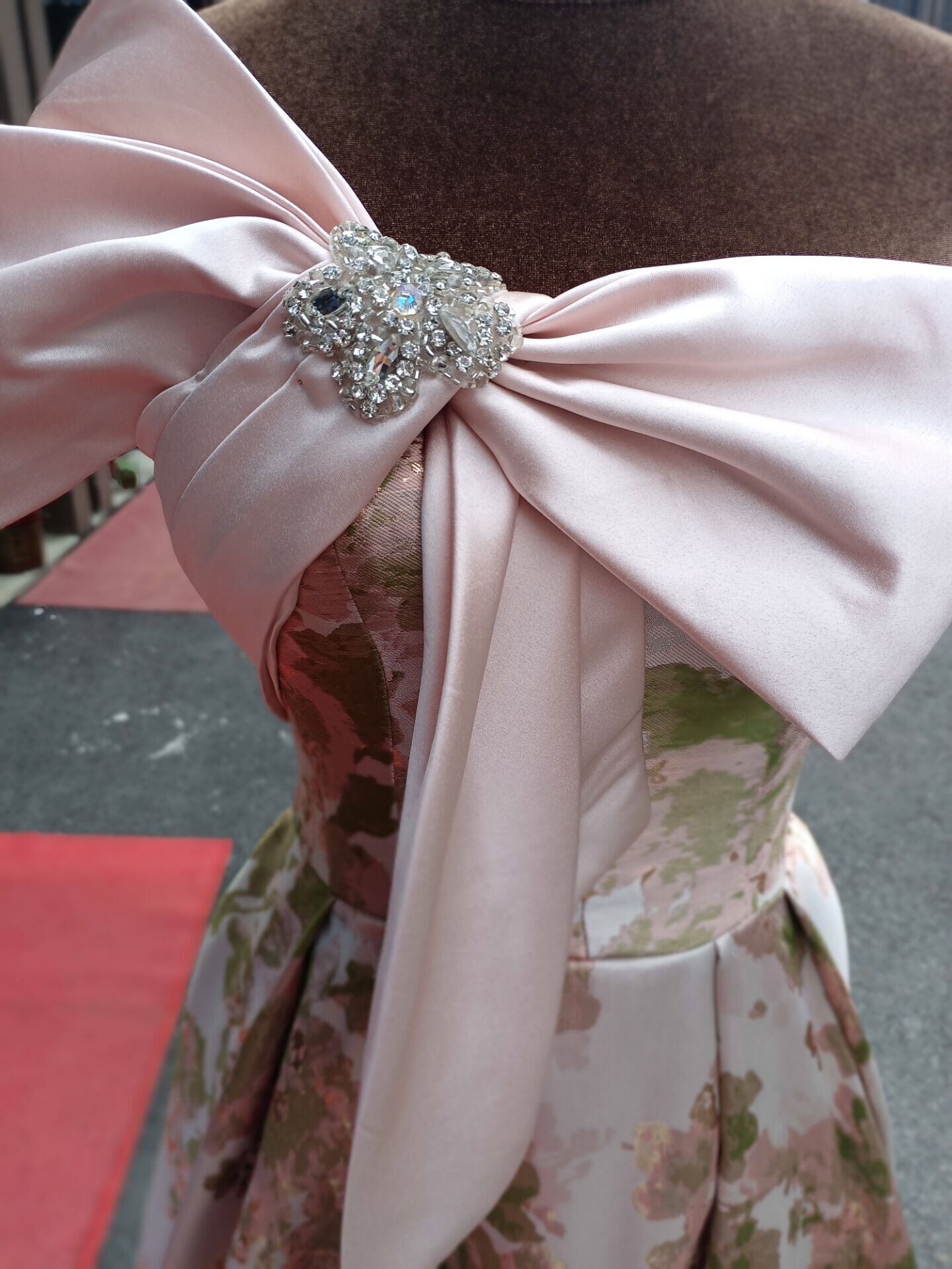 可愛い パーティードレス プリント模様 リボン ベアトップ ピンク 編み上げ 演奏会/音楽会 ロング