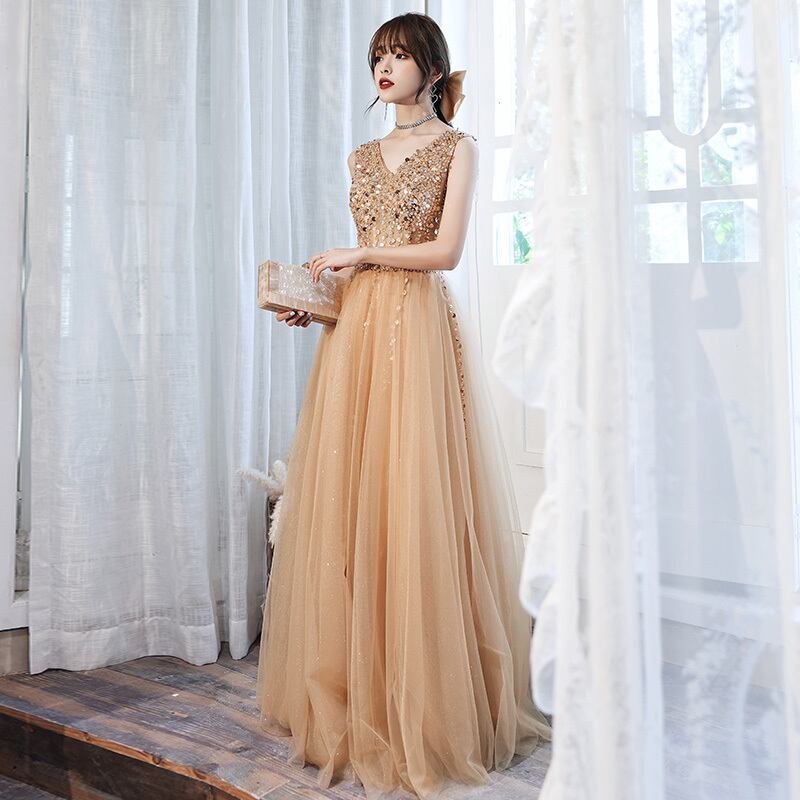 演奏会/音楽会 シャンパン色 編み上げ Vネック ロング パーティードレス キラキラ ノースリーブ ソフトチュール